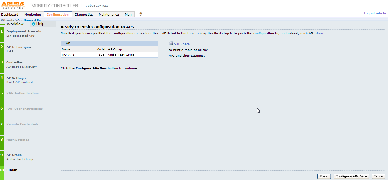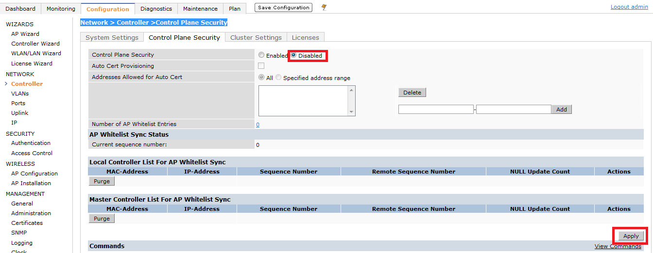 Disable Control Plane Security so as to allow APs to connect to the Controller automatically. If the feature is Enabled, one has to manually add each of the APs. For a lab setup – we will disable the feature to save time. Disabling this feature allows APs to automatically connect to the Controller.