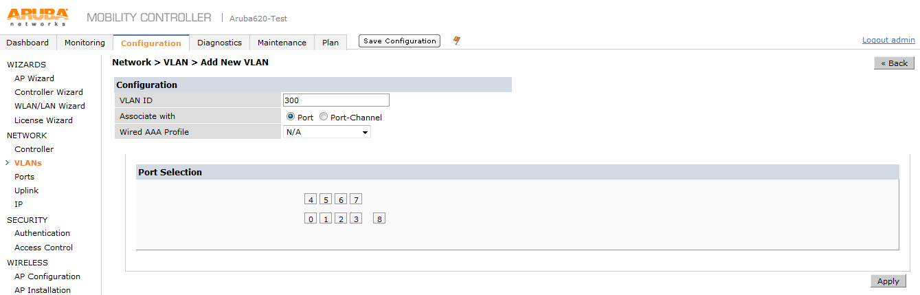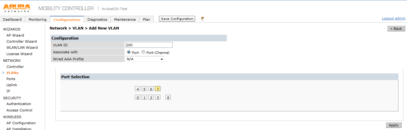 Next we configure VLANs on the controller. We will create the following VLANs: