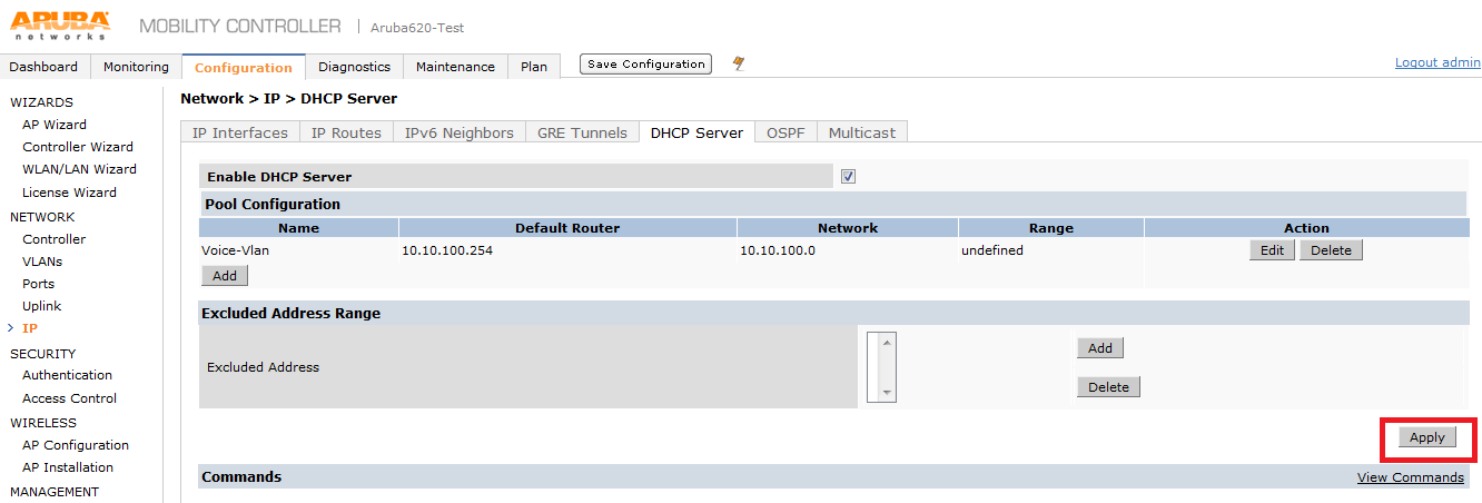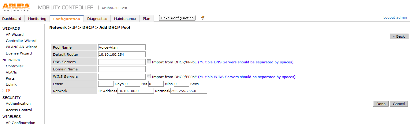 ip dhcp pool "Voice-Vlan" default-router 10.10.100.254 lease 1 0 0 0 network 10.10.100.0 255.255.255.0 !