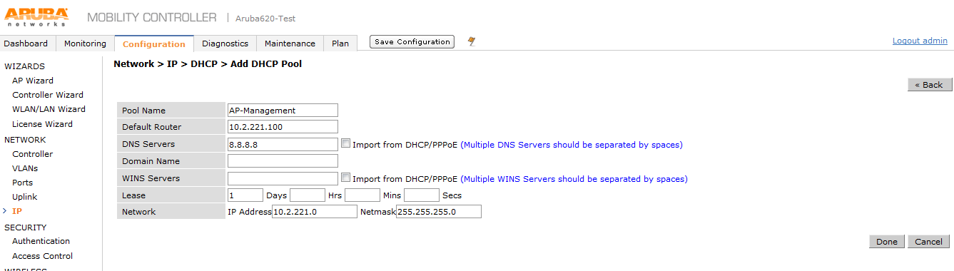ip dhcp pool "AP-Management" default-router 10.2.221.100 dns-server 8.8.8.8 lease 1 0 0 0 network 10.2.221.0 255.255.255.0 !