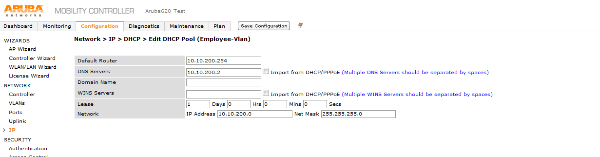 ip dhcp pool "Employee-Vlan" default-router 10.10.200.254 dns-server 10.10.200.2 lease 1 0 0 0 network 10.10.200.0 255.255.255.0 !