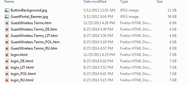 [UserXX@ServerXX ~]$ cd login38 [UserXX@ServerXX login38]$ ll total 140 -rw-rw-r--. 1 UserXX UserXX 11004 May 12 2012 ButtonBackground.jpg -rw-rw-r--. 1 UserXX UserXX 59601 May 11 2012 GuestPortal_Banner.jpg -rw-rw-r--. 1 UserXX UserXX 3940 Aug 27 16:39 GuestWireless.Terms_DE.htm -rw-rw-r--. 1 UserXX UserXX 5997 Nov 25 2013 GuestWireless.Terms.htm -rw-rw-r--. 1 UserXX UserXX 3448 Aug 27 17:50 GuestWireless.Terms_LIT.htm -rw-rw-r--. 1 UserXX UserXX 3810 Aug 27 17:10 GuestWireless.Terms_POL.htm -rw-rw-r--. 1 UserXX UserXX 6000 Aug 27 16:57 GuestWireless.Terms_RU.htm -rw-rw-r--. 1 UserXX UserXX 6292 Aug 27 18:10 login_DE.html -rw-rw-r--. 1 UserXX UserXX 6665 Nov 25 2013 login.html -rw-rw-r--. 1 UserXX UserXX 6254 Aug 27 17:52 login_LIT.html -rw-rw-r--. 1 UserXX UserXX 6328 Aug 27 18:41 login_POL.html -rw-rw-r--. 1 UserXX UserXX 6656 Aug 27 17:15 login_RU.html