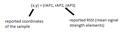 - At each sample location, an array of RSS values is recorded into the database (radio map or training set). The size of the location vector (array) depends on the number of APs that receive the signal). Signal of the device during sampling varies due to fading and this variation needs to be accounted for during calculations depending on the technique.