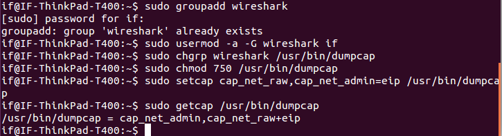 - Change the group ownership of file dumpcap to wireshark
