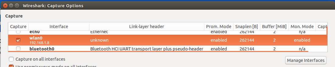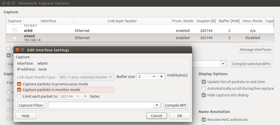 Enable Monitor mode for the wlan interface by double-clicking on it and checking the capture packets in monitor mode box.