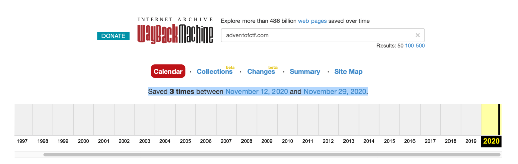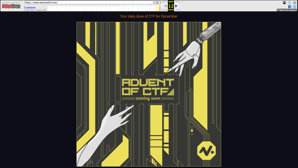Well, I remember there was an announcement page that had been up for a while but I did not search for any flags on that page. We would have to find the previous website in the archives. We can use the WayBackMachine to go back in time. Let’s look for adventofctf.com. We see that it was saved 3 times between November 12, 2020 and November 29, 2020.