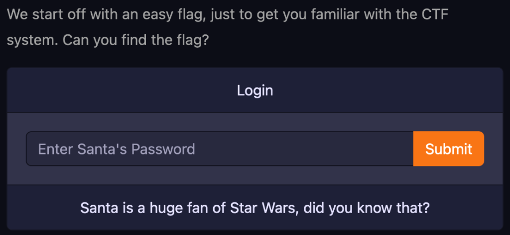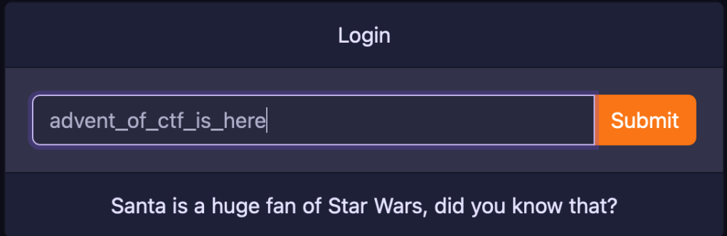 We are asked to visit https://01.adventofctf.com to start the challenge. This is what we get when we navigate to the site. A password is required, which we obviously do not have yet.