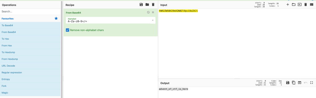 Cyberchef to the rescue. We see that the string decodes to advent_of_ctf_is_here.