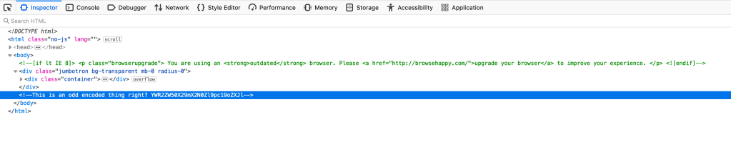 The page hints on finding a flag. Let’s check Developer Tools. What immediately catches my eye is the encoded string YWR2ZW50X29mX2N0Zl9pc19oZXJl in the source code of the page. This looks like Base64.