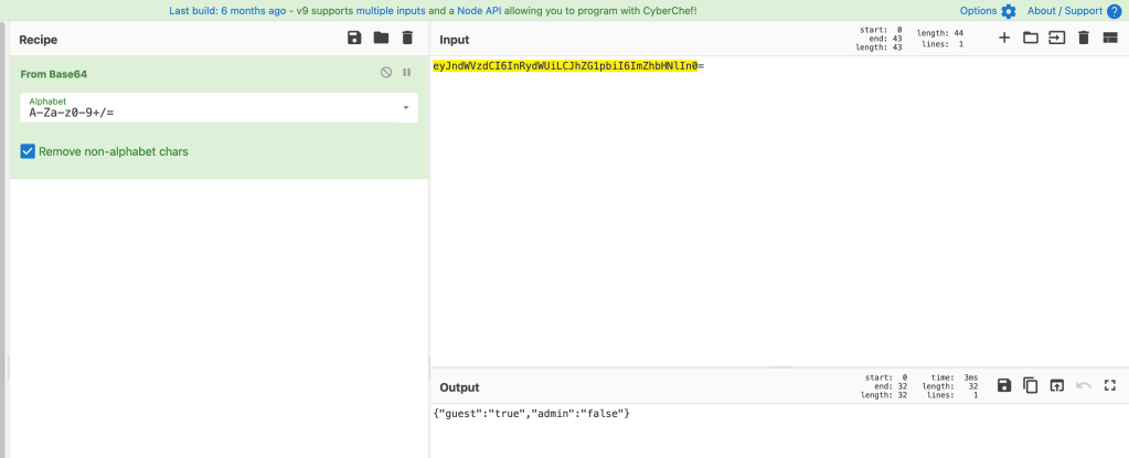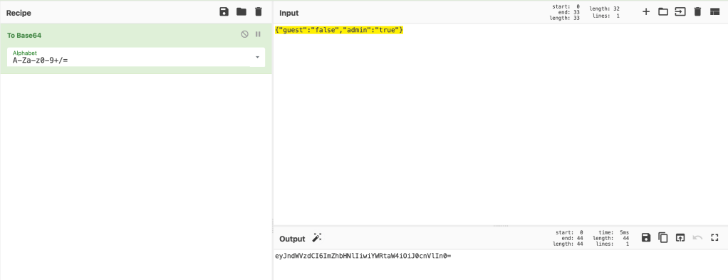 Decoding the Base64 string gives us the value {“guest”:”true”,”admin”:”false”}. Well, I do not want to be logged in as a guest and would like to have admin privileges too.