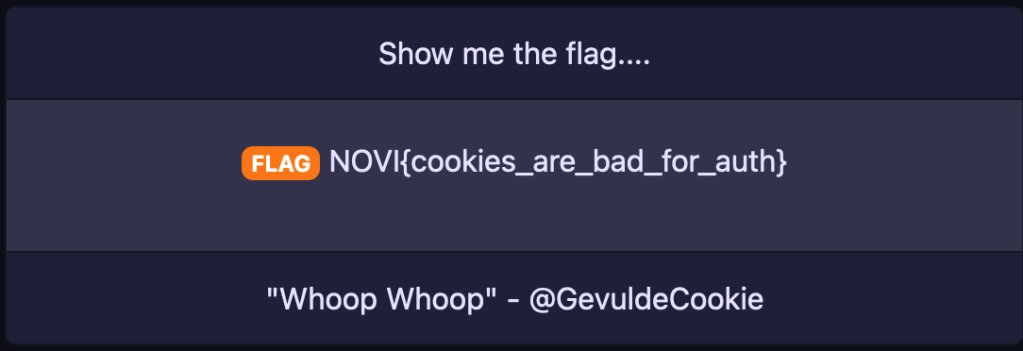 We then refresh the page and get the flag NOVI{cookies_are_bad_for_auth}.