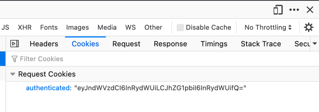 Let’s try modify that cookie value to {“guest”:”false”,”admin”:”true”}. We need to encode it back to Base64. We get a new value of eyJndWVzdCI6ImZhbHNlIiwiYWRtaW4iOiJ0cnVlIn0= that we can modify our cookie to.