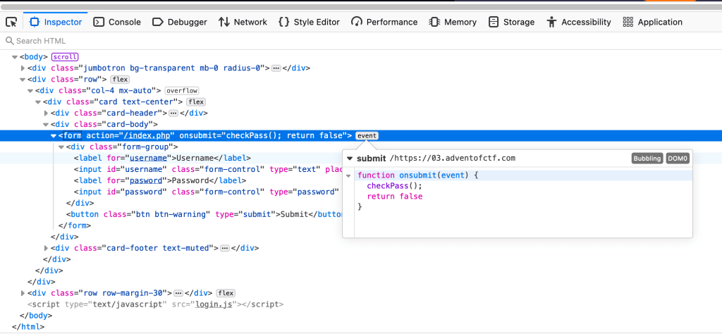 I went ahead and inspected the source and found a script reference to Javascript. Looks like when we submit our credentials the form calls a function checkPass()