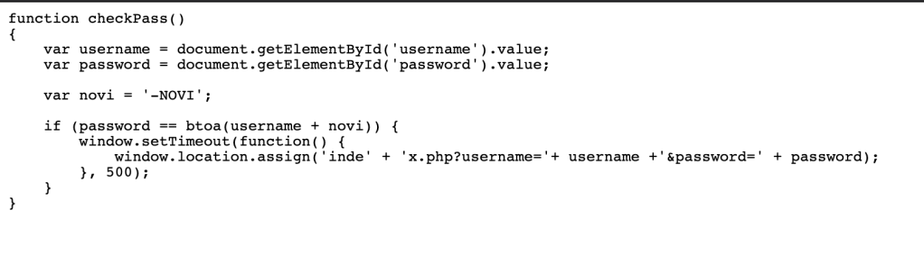 Since this btoa() value is being compared to our password, lets try figure out the value of btoa(username + novi). Returning to the variables just above the if comparison, we see that the username value is simply taken from the user input “username” field and the novi variable is -NOVI.