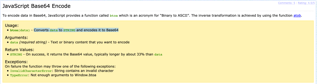Let’s ask our friend Google what btoa() means. Several resources like this one here at Base64 Guru point to it being a means to convert data to string and encode it to Base64
