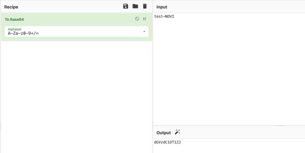 In my case, username=test so the string username+novi is test-NOVI. Converting that to base64 in CyberChef gives us dGVzdC1OT1ZJ.