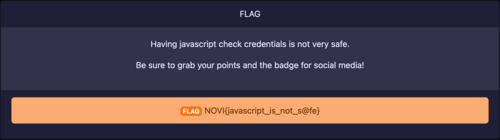 Now that we know what the password should be dGVzdC1OT1ZJ, let’s use that as a password for username:test and walaah! We found our flag: NOVI{javascript_is_not_s@fe}. Not bad for 300 points :)!