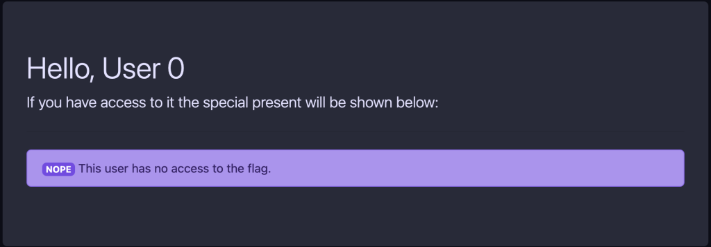 Sure enough, the URL seems to be redirected after a couple of seconds to the URL https://04.adventofctf.com/index.php?token=eyJ1c2VyaWQiOjB9.1074. We see that token to be equivalent to the key that was set in the startup() function.