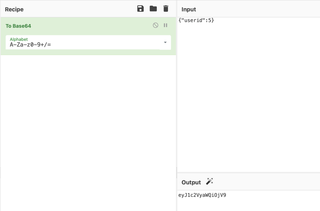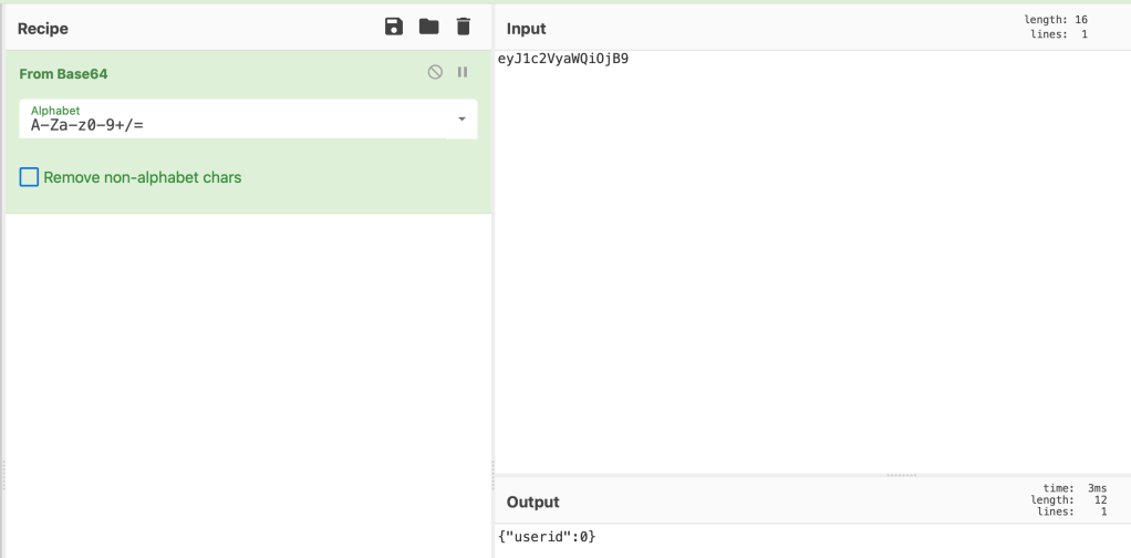 That eyJ1c2VyaWQiOjB9 looks like a base64 text. Let’s doublecheck in CyberChef. Sure enough, it points to {"userid":0}.