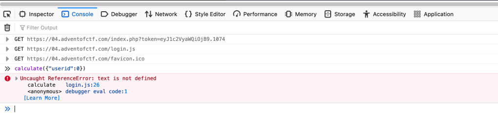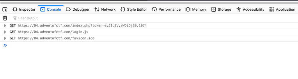 Let’s go back and try to resolve the challenge now. I know that am supposed to take note of the URL so let’s navigate to https://04.adventofctf.com/ and check what the console shows us.