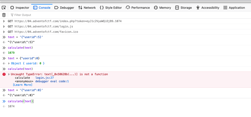 The calculate() function uses the text part that was derived after decoding part of the first part of the key value eyJ1c2VyaWQiOjB9. Let’s then try call that function in the browser.