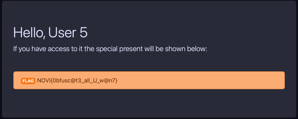 Now, let’s try combine that into a token value eyJ1c2VyaWQiOjV9.1079. When I input URL https://04.adventofctf.com/index.php?token=eyJ1c2VyaWQiOjV9.1079 into the browser, I get the flag for just a few seconds. Good enough for me to get my FLAG NOVI{0bfusc@t3_all_U_w@n7} :).