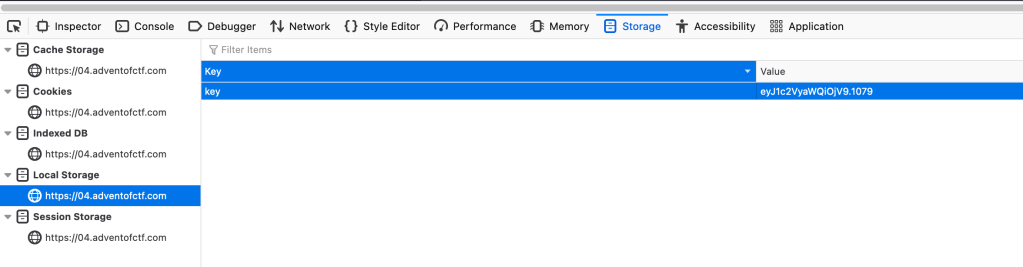 The timeout might be an issue for some so a better way would be to look for the location where the key is being saved in the browser. If you remember, the code does set the key value in the localStorage, let’s try find that. I looked into the storage section of the browser and found Local storage. In here, we do see the key values. I was easily able to change that value by double clicking the value field.