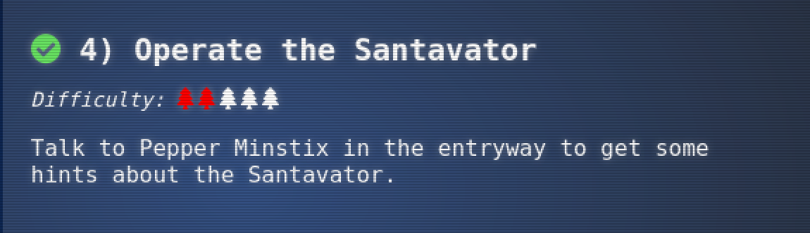 - Help elves solve their challenges and they will provide hints to solving the objectives