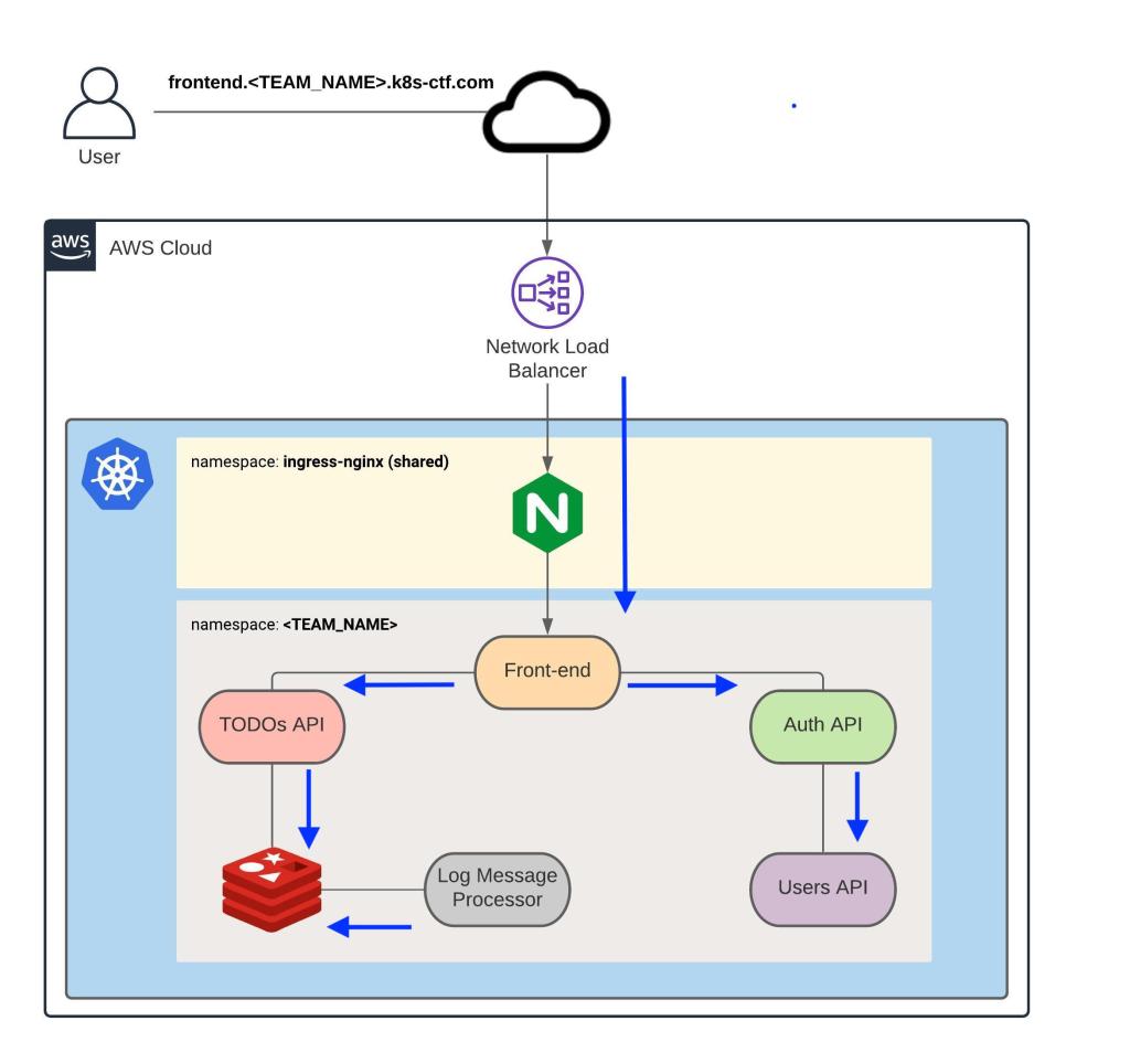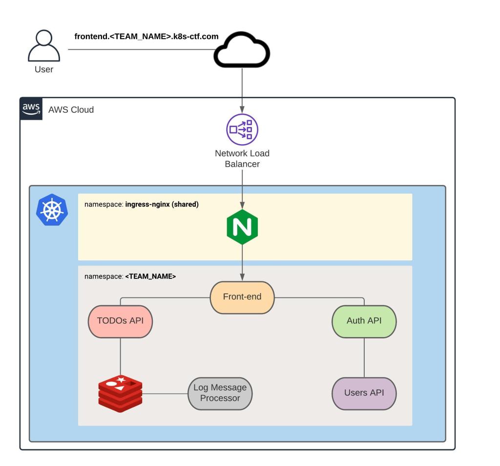 The CTF walks us through the deployment of a TODO application that comprises of 5 microservices. The Kubernetes cluster itself is run in Amazon Elastic Kubernetes Service.