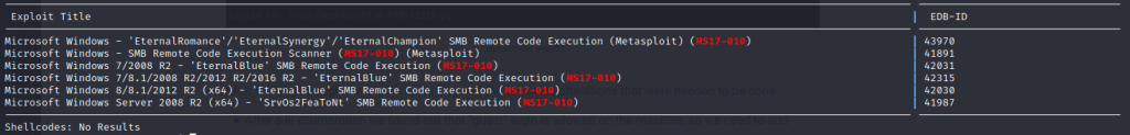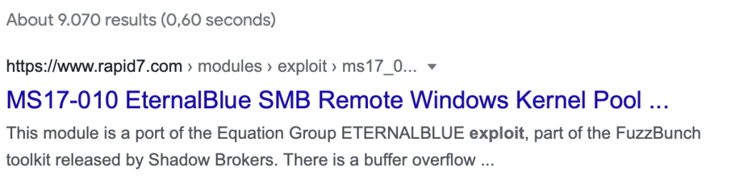 We get a bunch of RPC ports open along with SMB. RPC is common to see with SMB but let’s try follow the SMB trail. We see that the machine is running Windows 7 SP 1. When I do a quick google search to see whether there are possible vulnerabilities with this version of Windows, the first hit we see points to EternalBlue. MS17-010 EternalBlue is a vulnerability that allowed for Remote Code Execution on Windows machines.