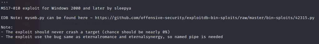 The output that we get shows that the machine is indeed vulnerable to ms17-010.