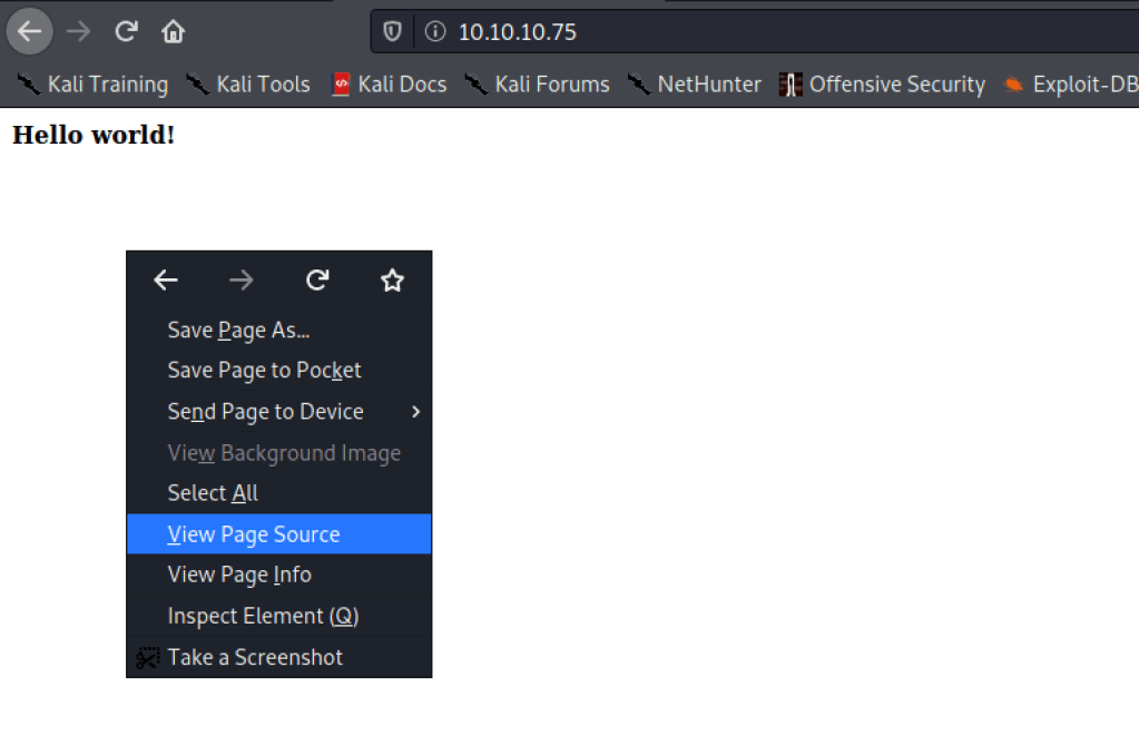 The best thing to do is first verify that http is running on the victim machine by navigating to the host using its IP address. We get a Hello World page.