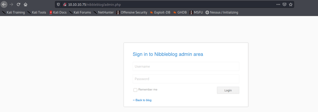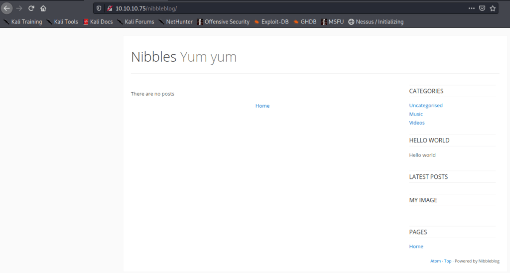 Let’s navigate to that directory. We see a blog but it looks rather empty. We can click on the links there to see if there is any login page or something interesting. So far, we find nothing. We do however see at the bottom that this is a Nibbleblog.