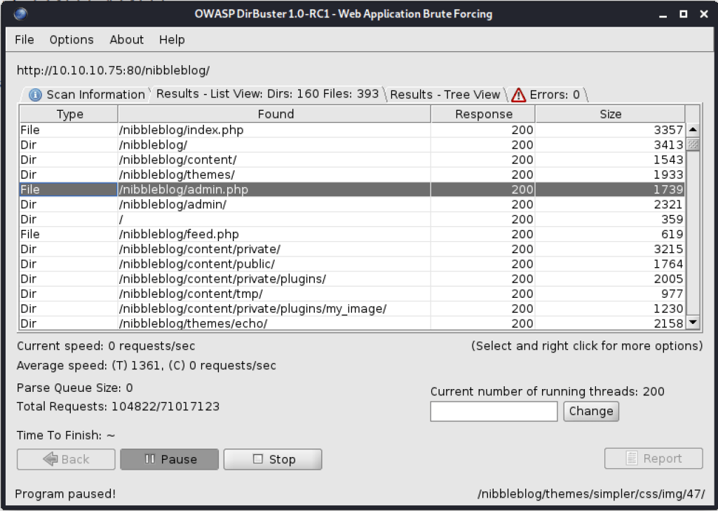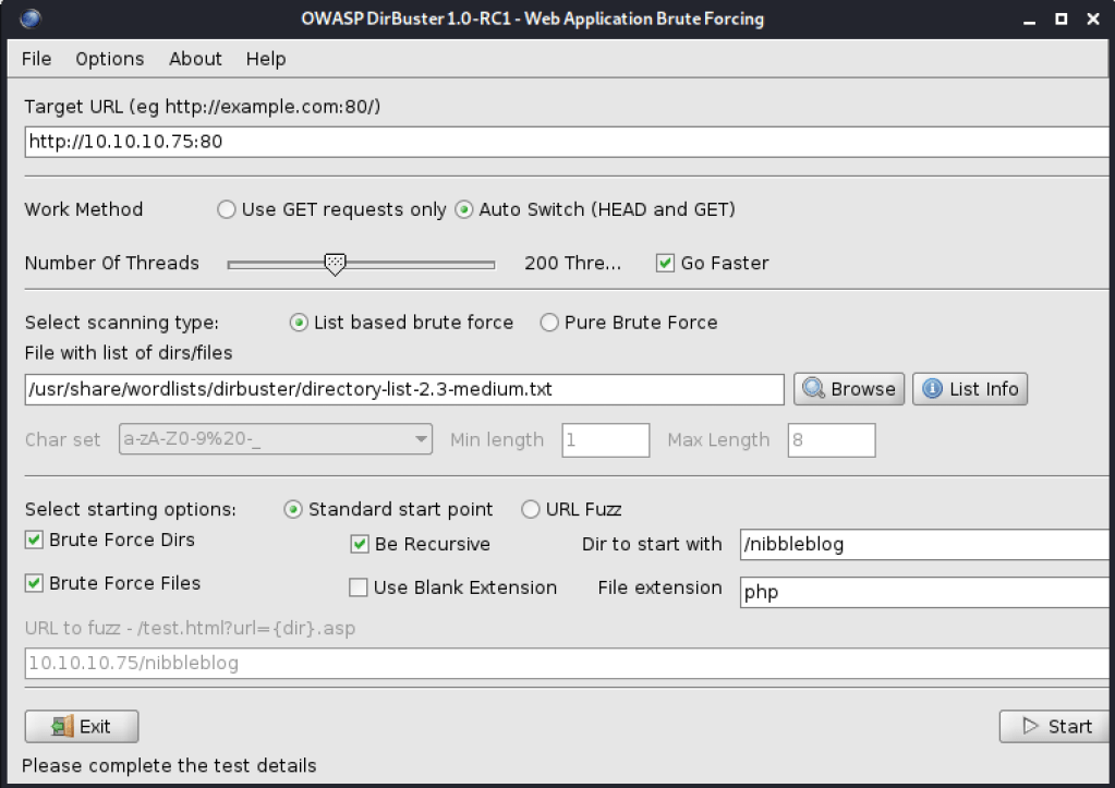 We use the dirbuster wordlist that is available on kali. We also point the starting directory to /nibbleblog.