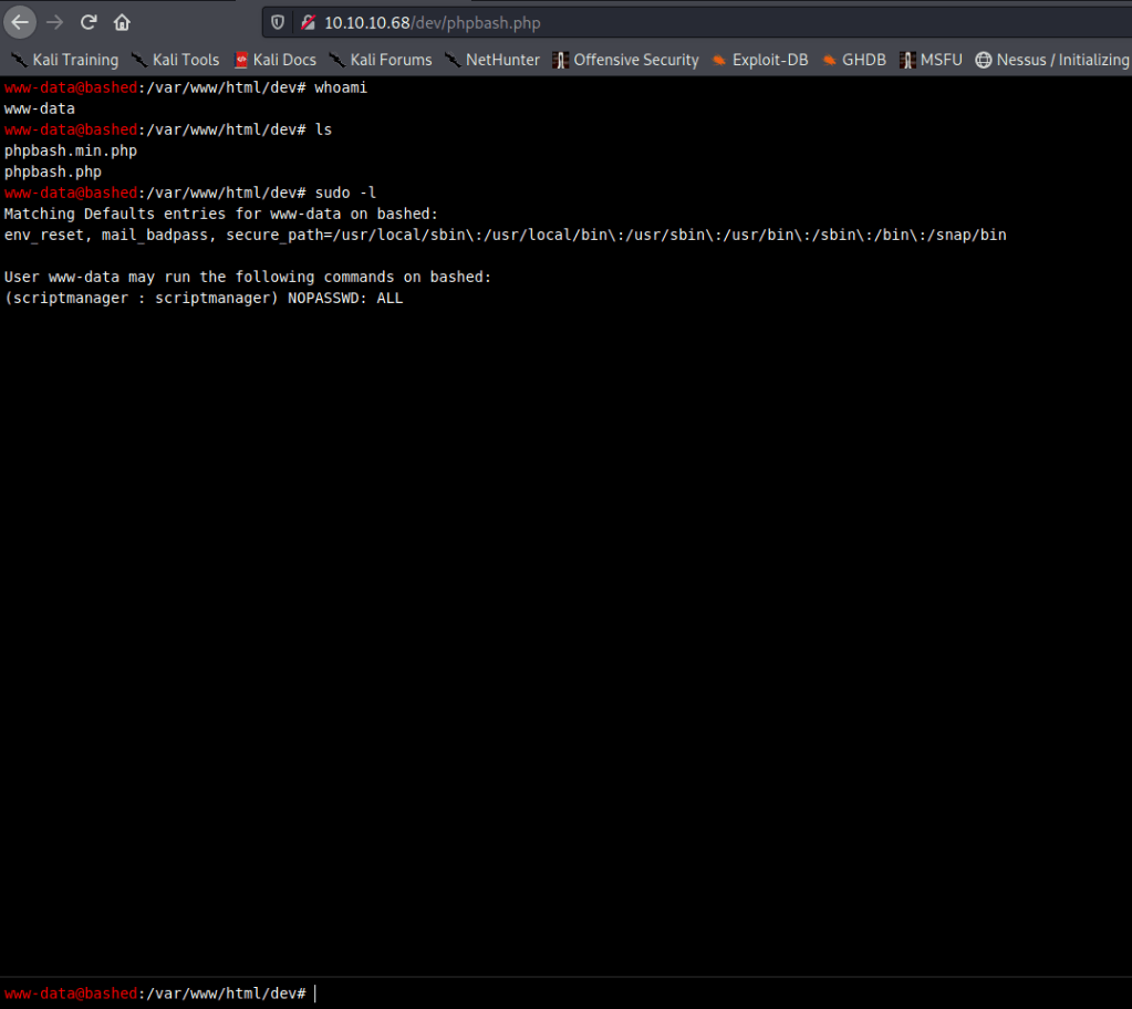 Sure enough, when we navigate to [http://10.10.10.68/dev/phpbash.php], we do get a terminal. It appears that we are logged in as www-data and that we can run all commands as scriptmanager without necessitating a password.